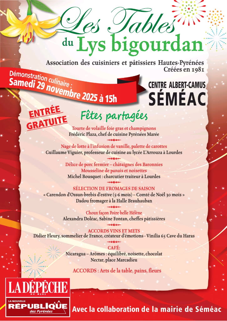 Présentation culinaire par les Tables du Lys Bigourdan – 39e Edition Samedi 25 novembre à 15h00 L’association Les Tables du Lys bigourdan est née à l’initiative de plusieurs professionnels de la cuisine et de la pâtisserie. Elle a pour objectif de promouvoir les produits du terroir et de transmettre les traditions culinaires aux jeunes. Une démonstration culinaire sera organisée par l’association à l’occasion de la 39ème édition des rencontres gastronomiques au CAC.